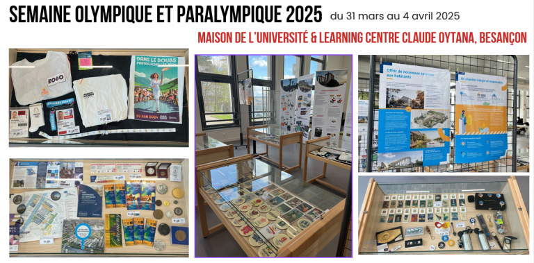 À l’occasion de la SOP 2025, le Learning Centre de Besançon a accueilli une exposition dédiée à l’univers olympique. Disposée dans les espaces de circulation, cette exposition mêlait vitrines thématiques et kakémonos explicatifs. Les visiteurs pouvaient y découvrir des ouvrages, des objets symboliques, ainsi que des documents retraçant l’histoire et les valeurs des Jeux Olympiques. Chaque élément était accompagné de textes pédagogiques pour permettre une compréhension approfondie et accessible à tous.